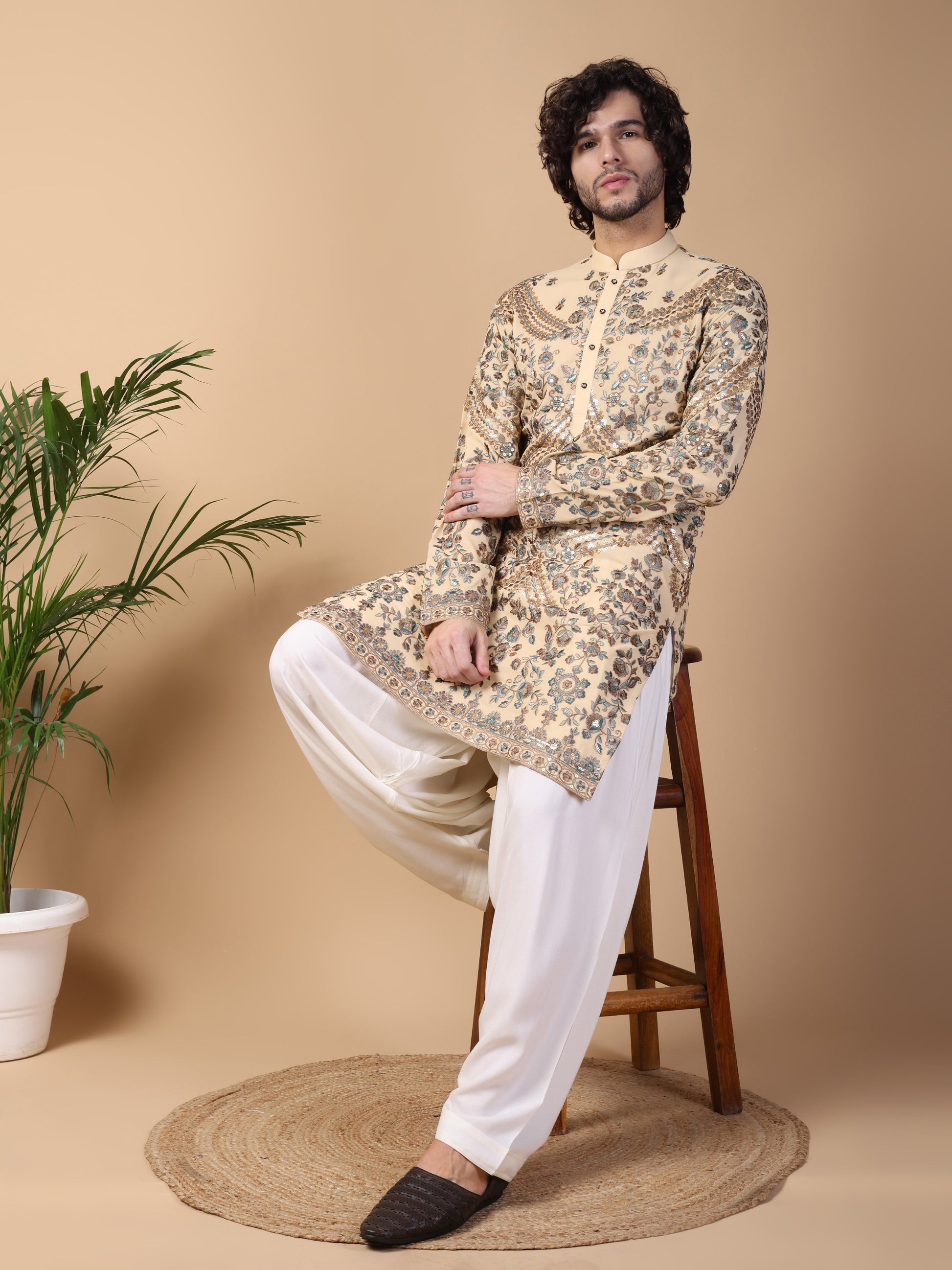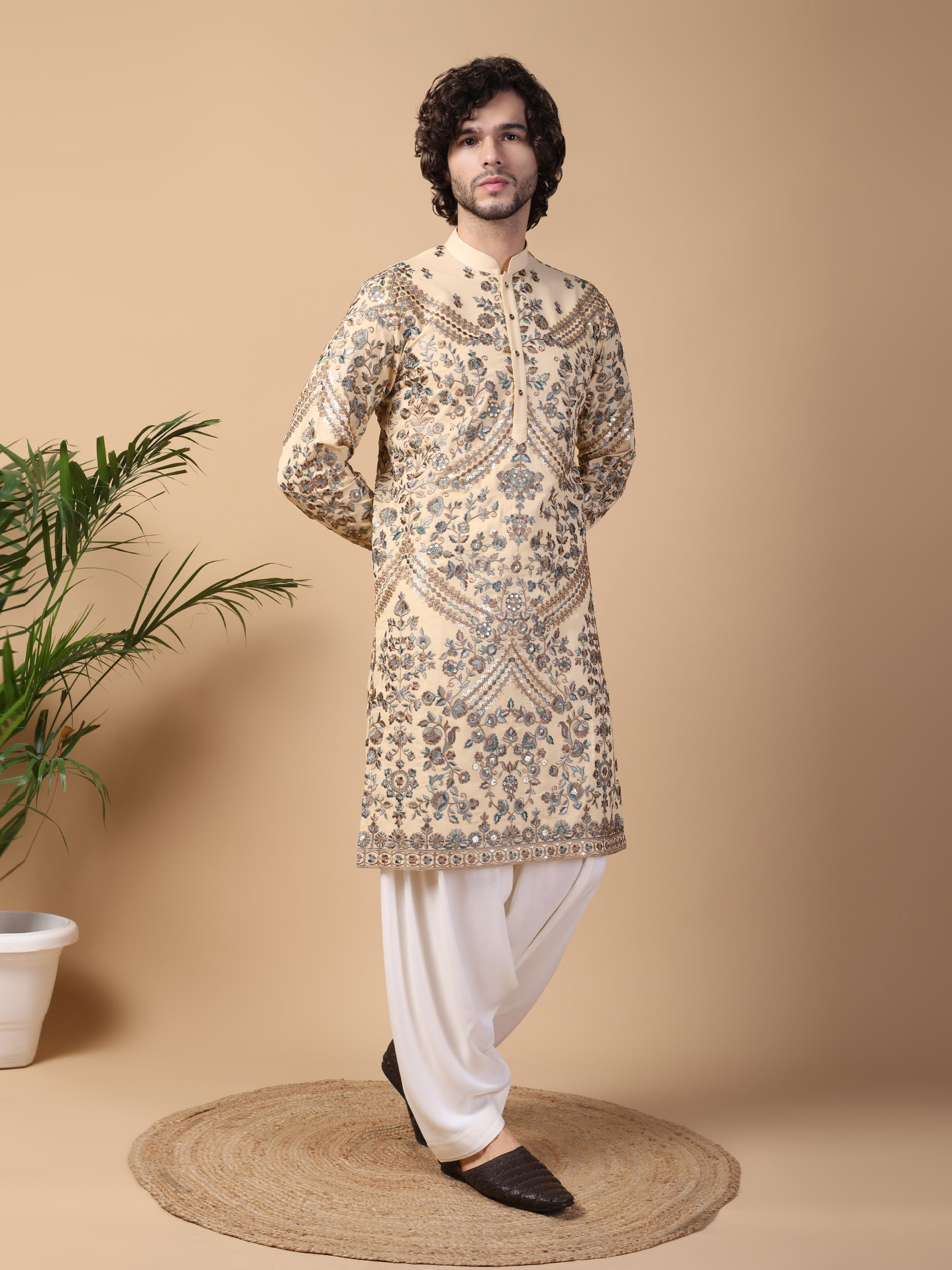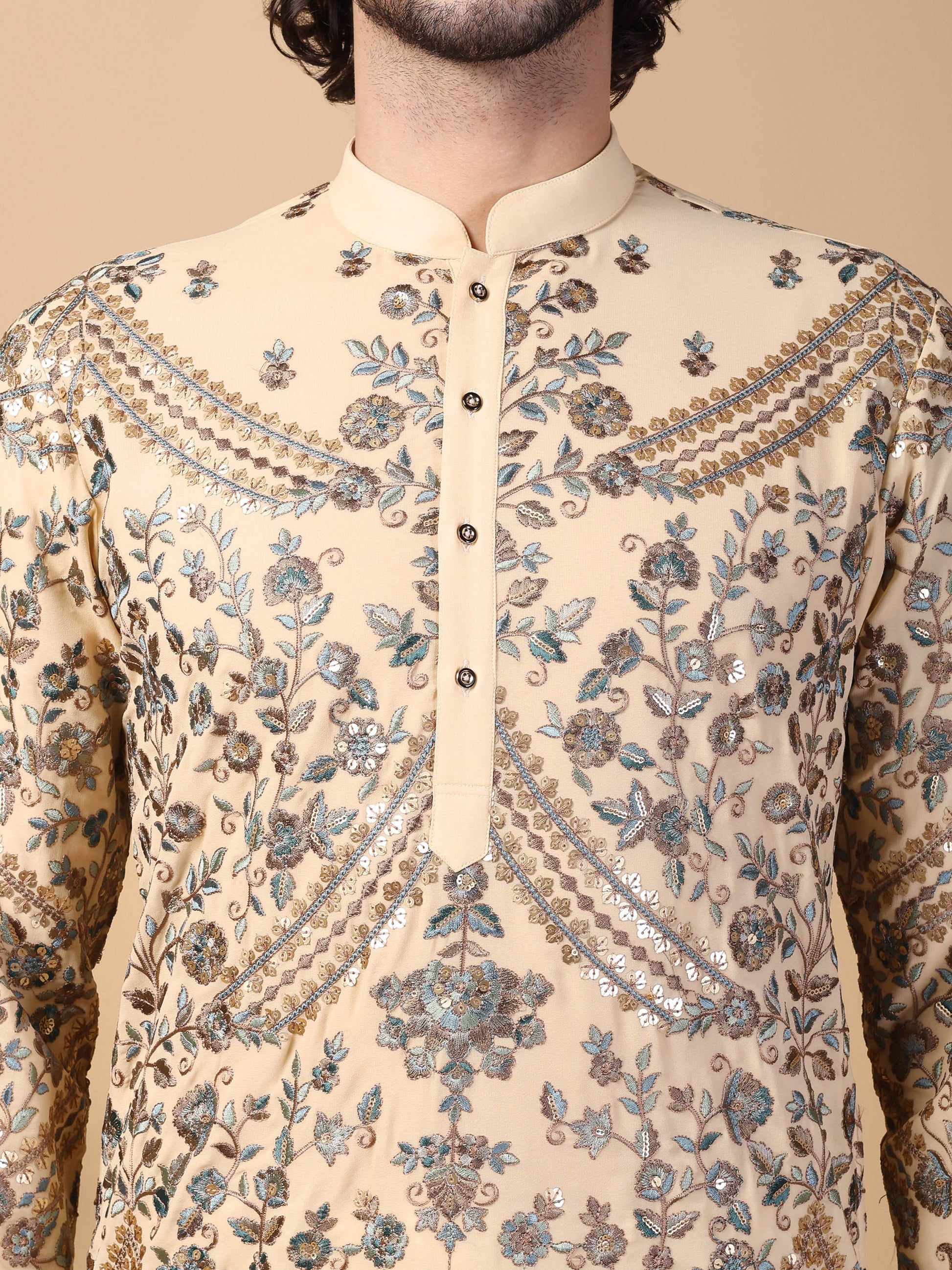 Crafted in fine georgette, this golden beige kurta features intricate thread embroidery in soft earthy tones with subtle shimmer.