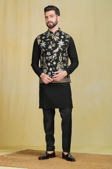 A plain black kurta set with threadwork floral printed jacket is a timeless and elegant outfit that embodies grace and simplicity.