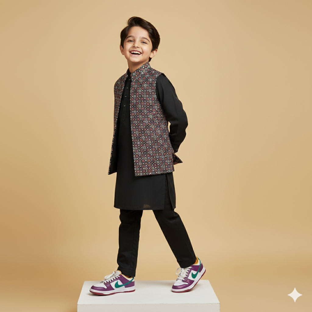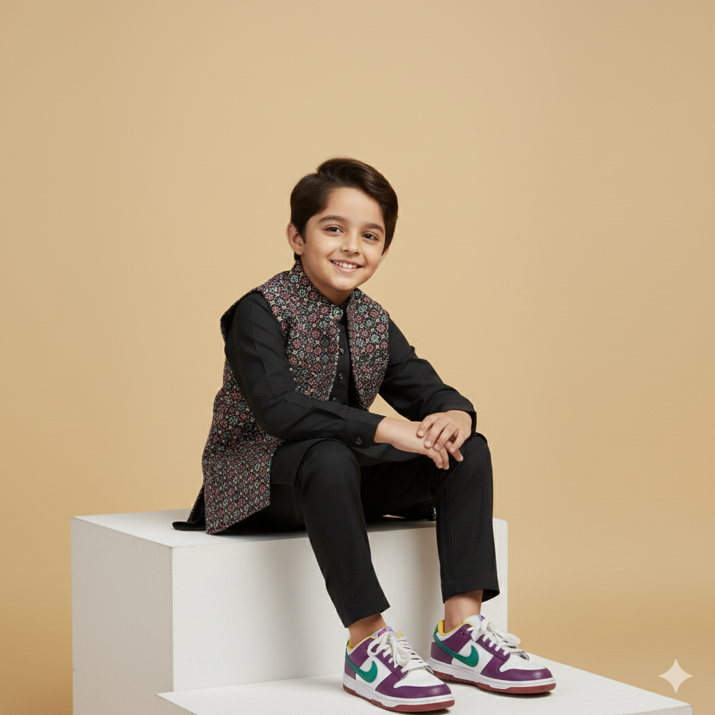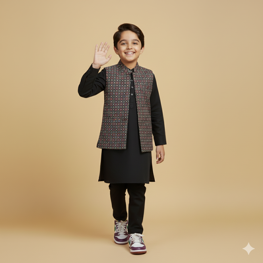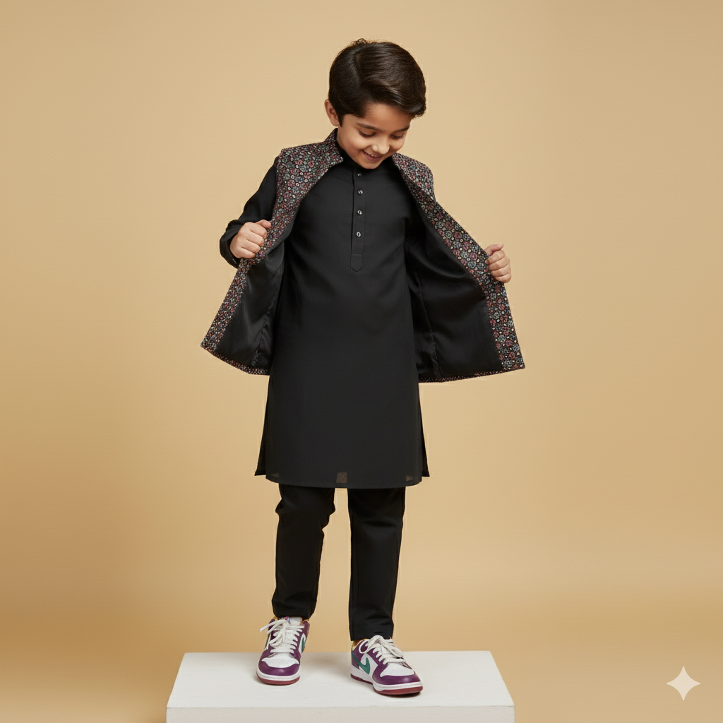 Classic black georgette kurta and pajama paired with a vibrant multicoloured front-open jacket. Fully fused for a polished look, this set adds a festive pop of color to traditional elegance.