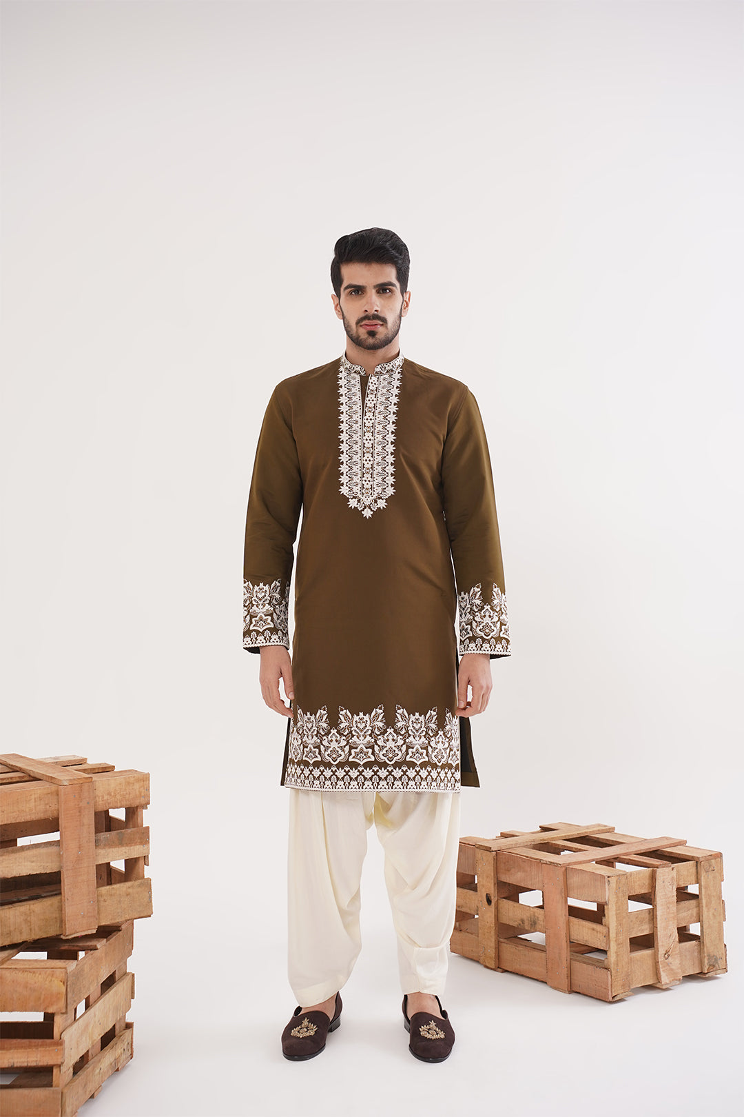 A Brown and white threadwork kurta. The detailed threadwork is visible along the neckline, sleeves, and hemline, adding an elegant touch to the garment.