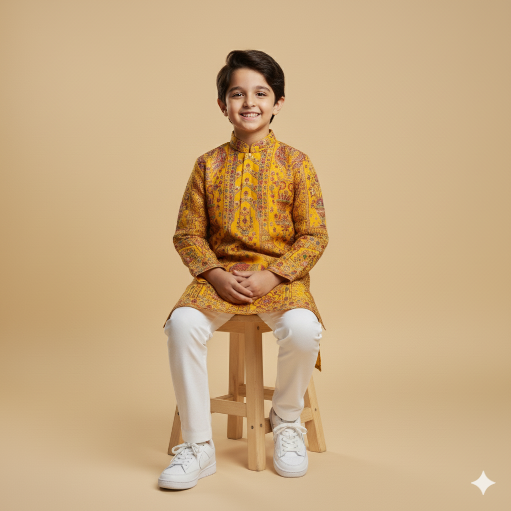 Celebrate timeless craftsmanship with this vibrant yellow kurta, featuring intricate threadwork in various traditional Indian motifs. Lightweight and comfortable, this piece beautifully blends heritage-inspired artistry with modern elegance, making it perfect for festive occasions or cultural celebrations.