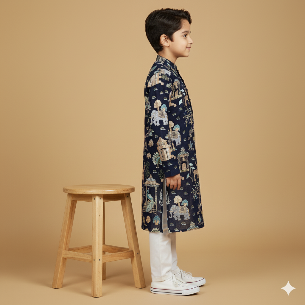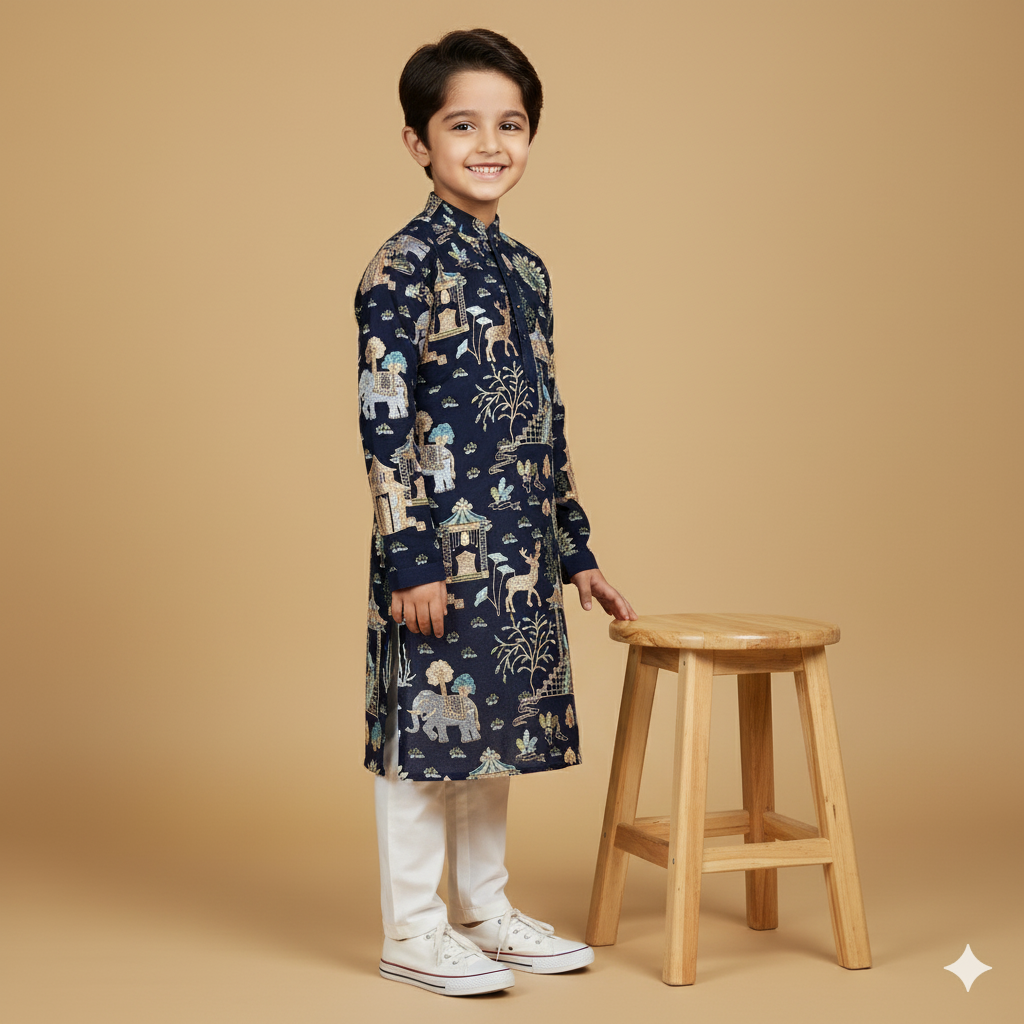 Storybook charm meets festive style in this fully fused navy georgette kurta. With intricate motifs of deer, birds, and royal elements, it’s perfect for little ones who love to dress with flair.
