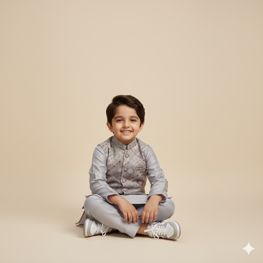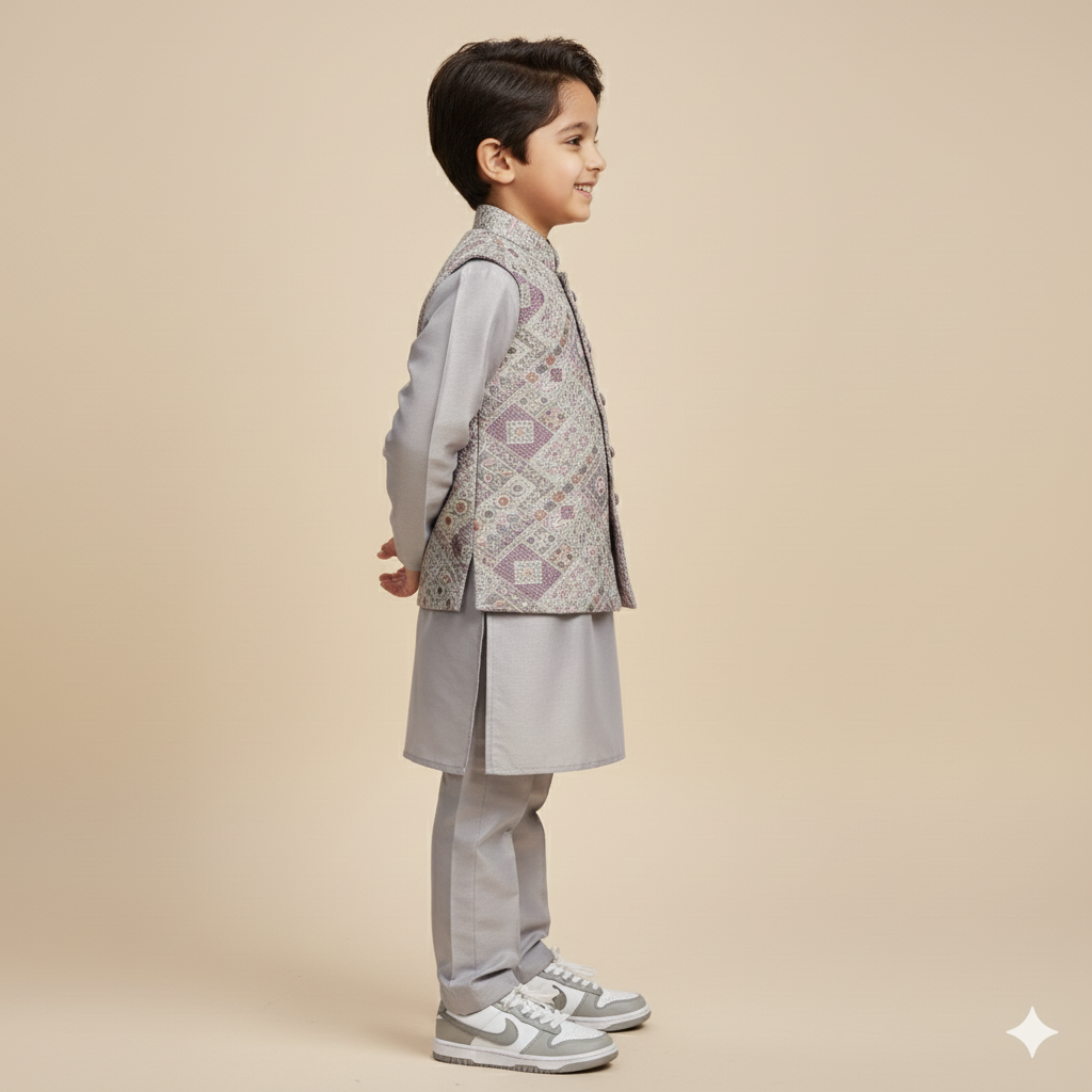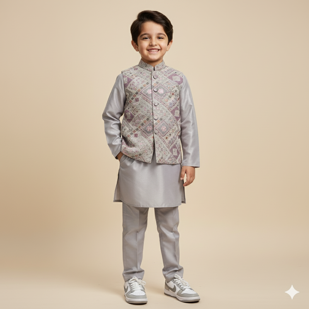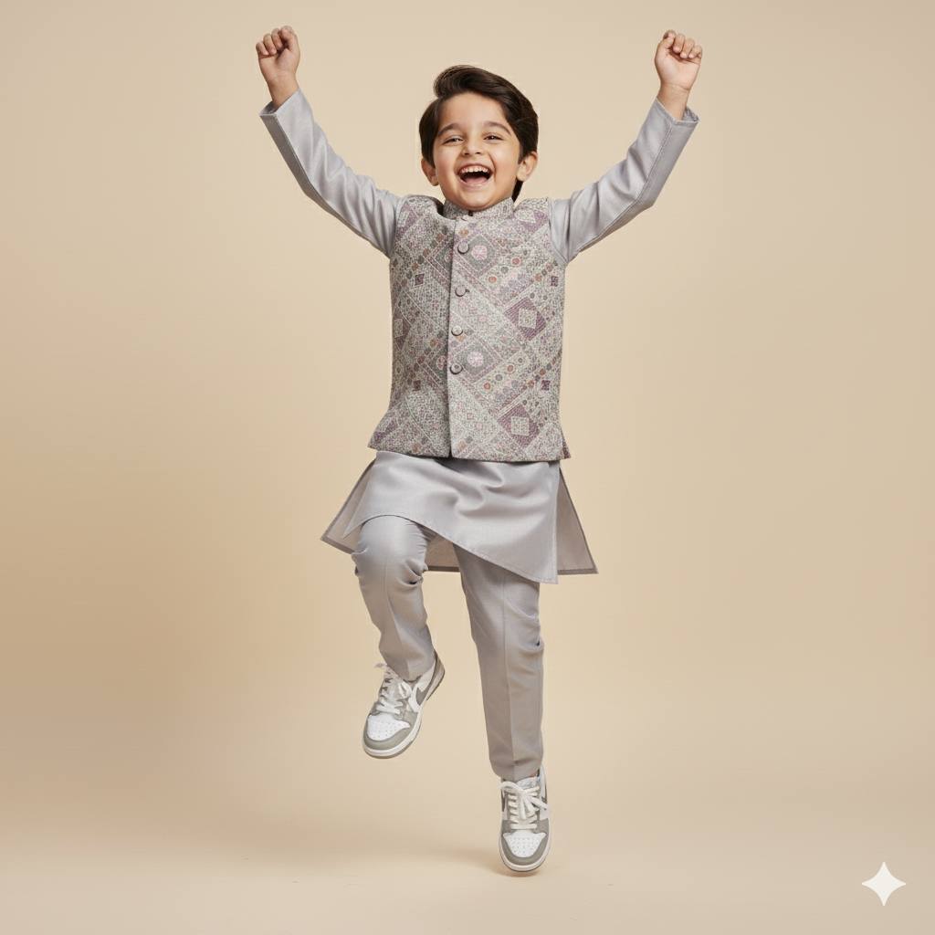 Soft grey kurta and pants in a breathable blended fabric, paired with a shimmering jacket. Fully fused for a refined finish, this set blends comfort with festive elegance