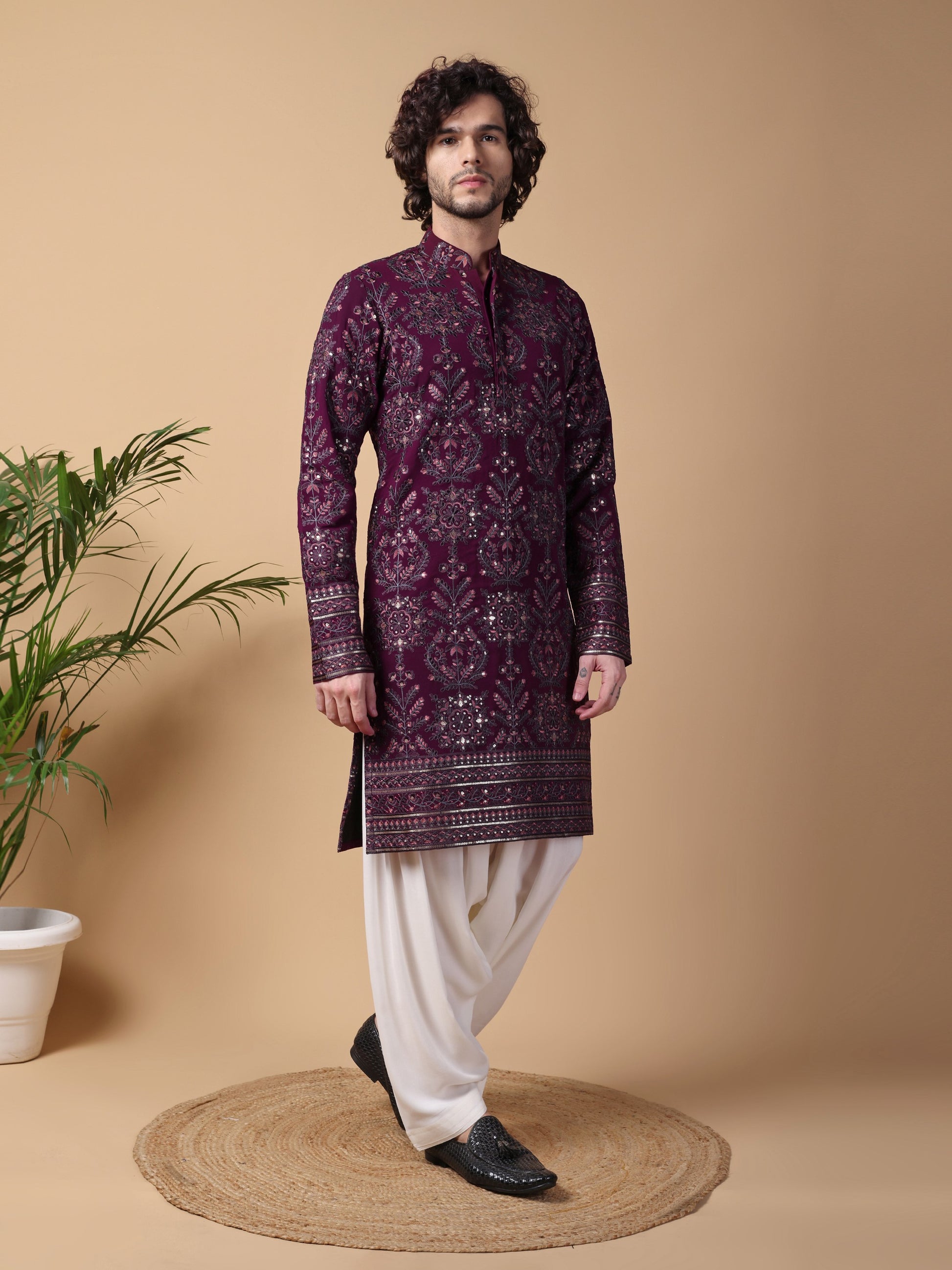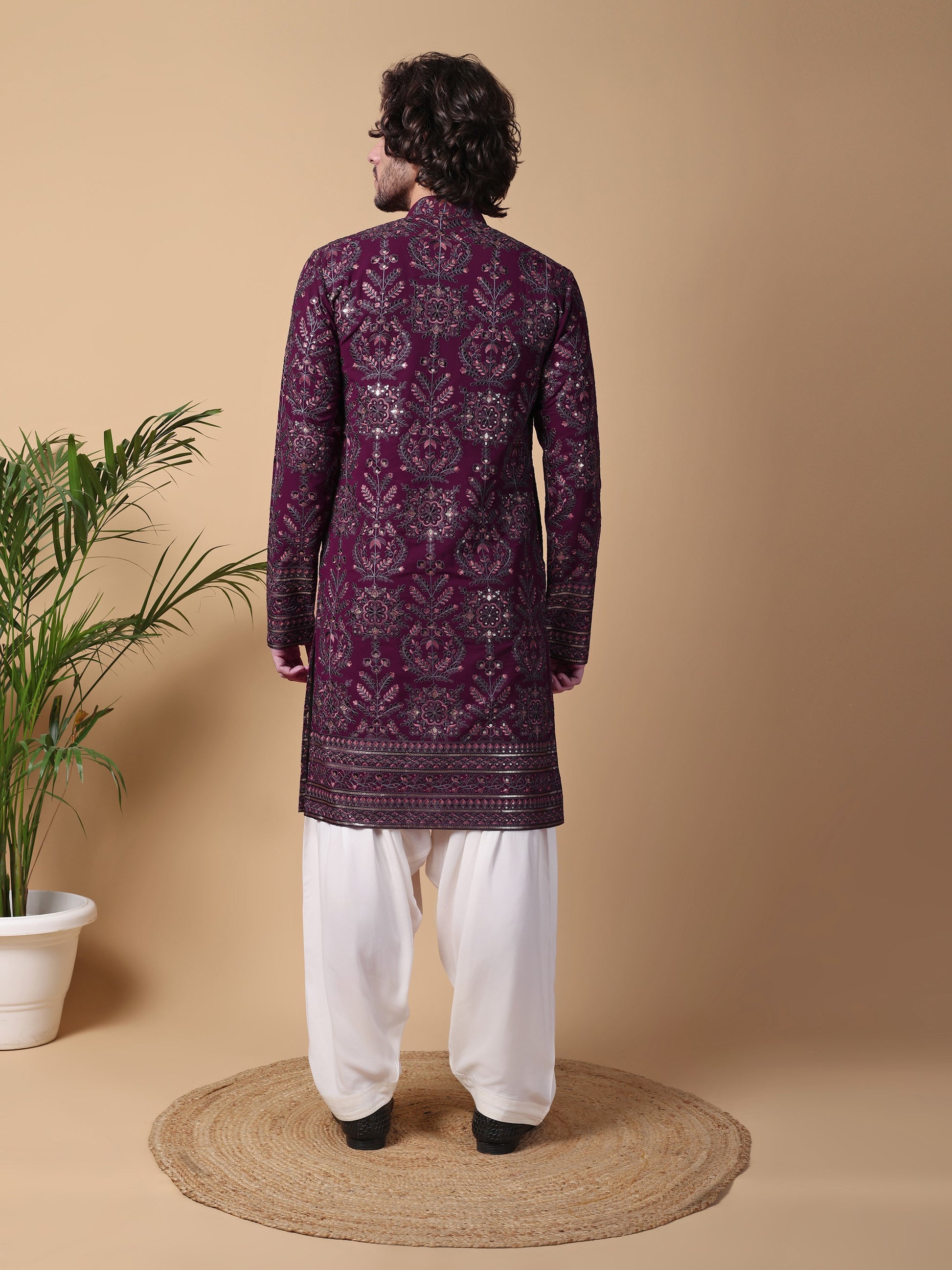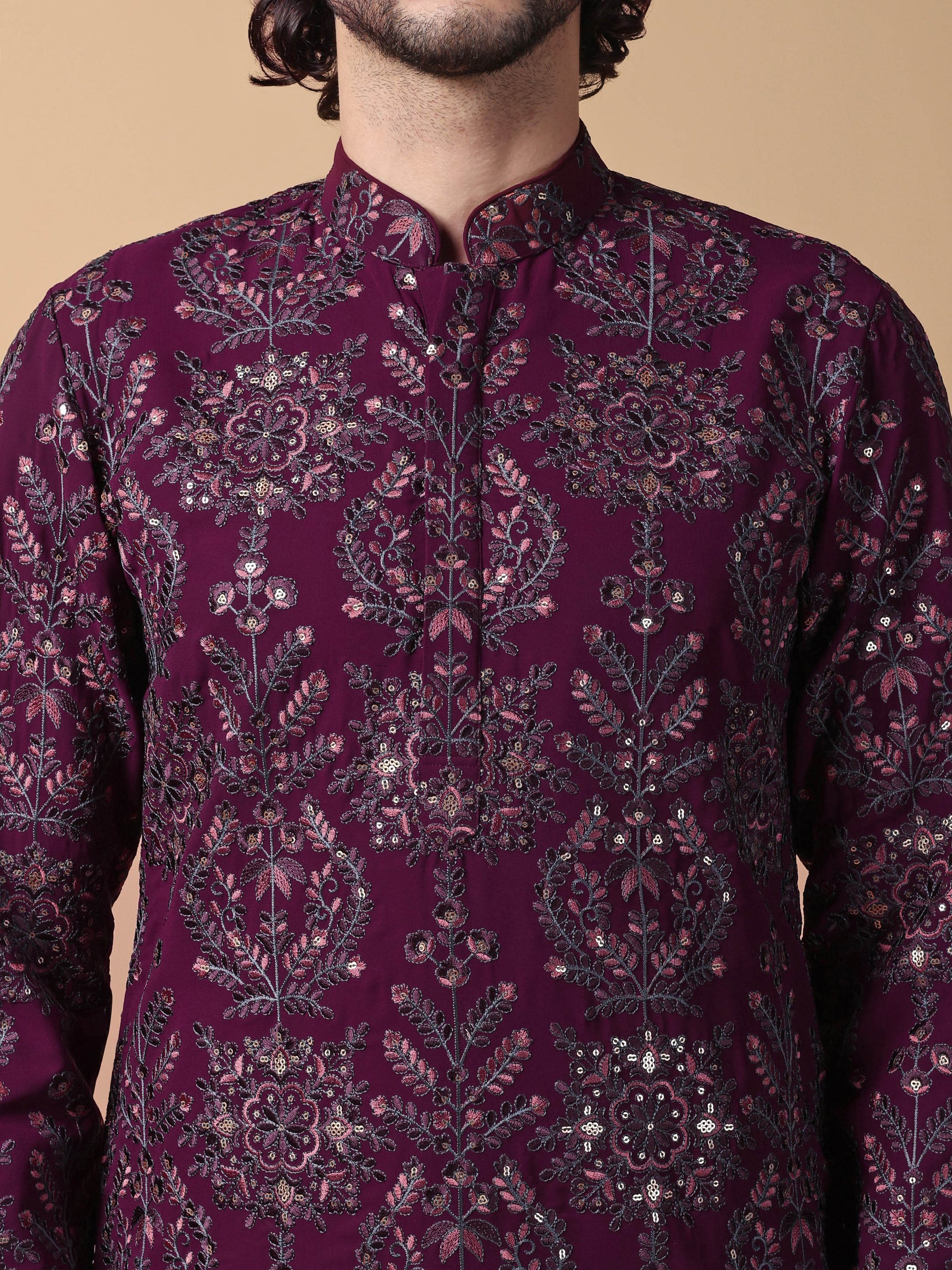 Thread and sequin embroidery in contrasting metallic tones such as bronze, copper, or antique gold.